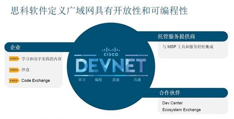 除了提供卓越的安全和應(yīng)用體驗(yàn)外,思科SD-WAN還具備開放性與可編程性。曹圖強(qiáng)表示,“首先,思科將通過 DevNet 開發(fā)平臺(tái)向所有用戶開放API,為開發(fā)人員提供更大價(jià)值;其次,對合作伙伴而言,思科希望提供一個(gè)可交互的平臺(tái)幫助用戶進(jìn)行分享。任何用戶有特殊的需求,可以在DevNet 與大家分享。具體來說,在整個(gè)安全的廣域網(wǎng)部署中, IT人員可以通過開放的平臺(tái),根據(jù)不同的環(huán)境和需求進(jìn)行二次開發(fā)!