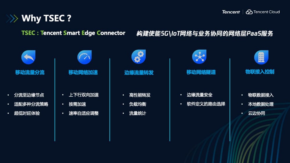 騰訊TSEC致力于構(gòu)建使能5G/IoT網(wǎng)絡(luò)與業(yè)務(wù)協(xié)同的網(wǎng)絡(luò)層PaaS服務(wù),具備移動流量分流、移動網(wǎng)絡(luò)加速、邊緣流量轉(zhuǎn)發(fā)、移動網(wǎng)絡(luò)隧道、物聯(lián)接入控制等核心功能。作為5G網(wǎng)絡(luò)與業(yè)務(wù)的橋梁,TSEC豐富的移動組件可以連接移動用戶、運(yùn)營商5G網(wǎng)絡(luò)和應(yīng)用,為高價(jià)值用戶和業(yè)務(wù)提供可自定義的、高質(zhì)量的、差異化的邊緣計(jì)算網(wǎng)絡(luò)服務(wù),實(shí)現(xiàn)應(yīng)用在云、邊、端的友好協(xié)同。